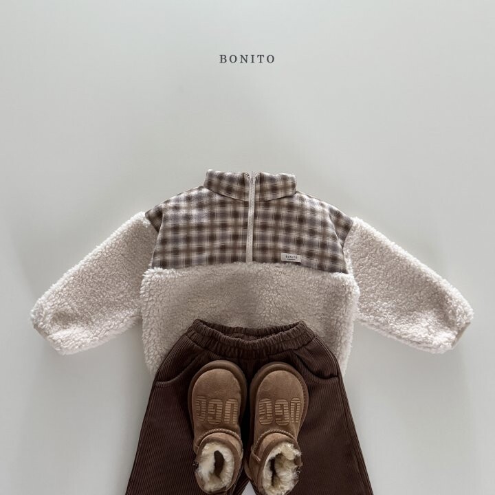 상단에는 부드러운 스웨이드 체크 원단,하단과 소매에는 포근한 덤블 퍼 원단을