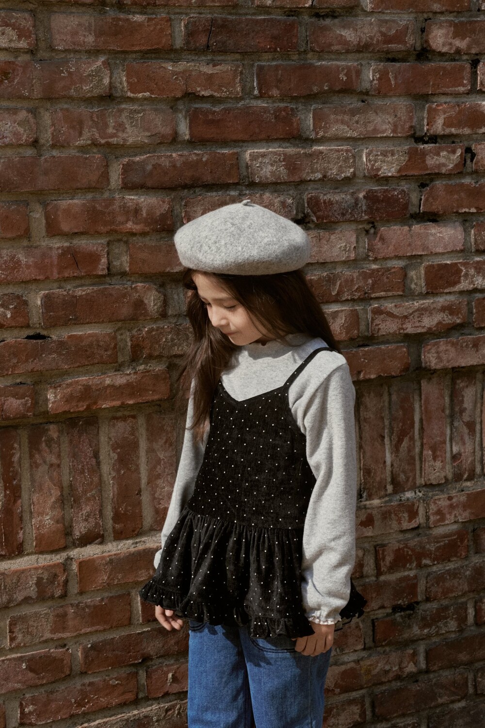벨벳터치캄에 피치된 폴리원단에 잔잔한 도트무니가있고, 밑단프릴이 넒어서 레이어드해서 입기좋아요